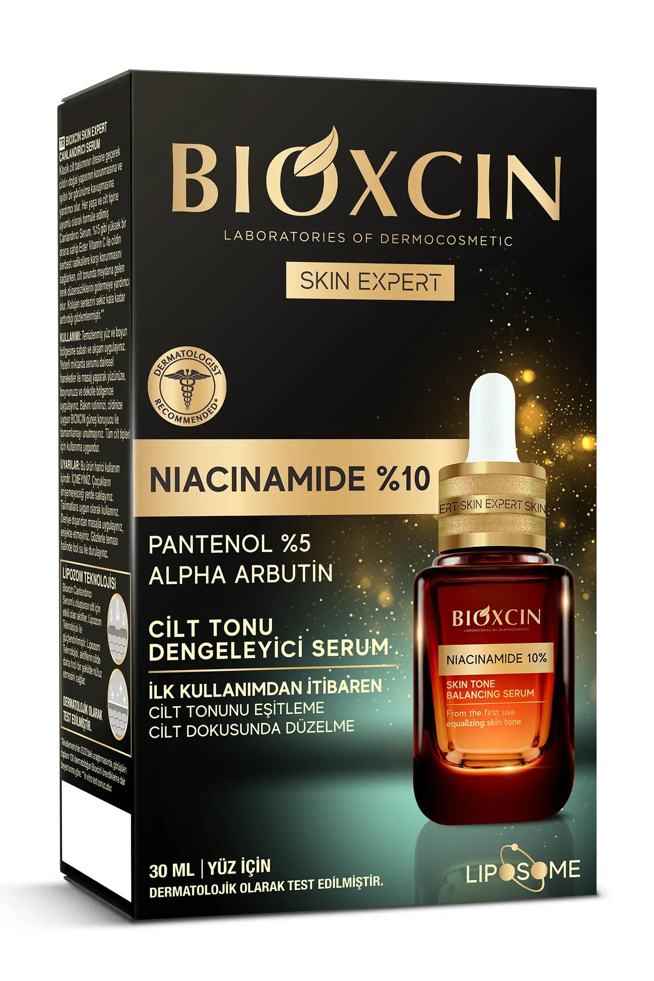 Bioxcin Skin Expert Cilt Tonu Dengeleyici Serum, %10 niacinamide, %5 pantenol ve alpha arbutin içerikleri ile cilt tonunu eşitlemeye ve cilt dokusunu iyileştirmeye yardımcı olur. İlk kullanımdan itibaren ciltte fark edilebilir bir düzelme sağlar ve pürüzsüz bir görünüm kazandırır. Niacinamide serum, cilt bariyerini güçlendirirken, hiperpigmentasyonu azaltarak lekelerin görünümünü hafifletir.