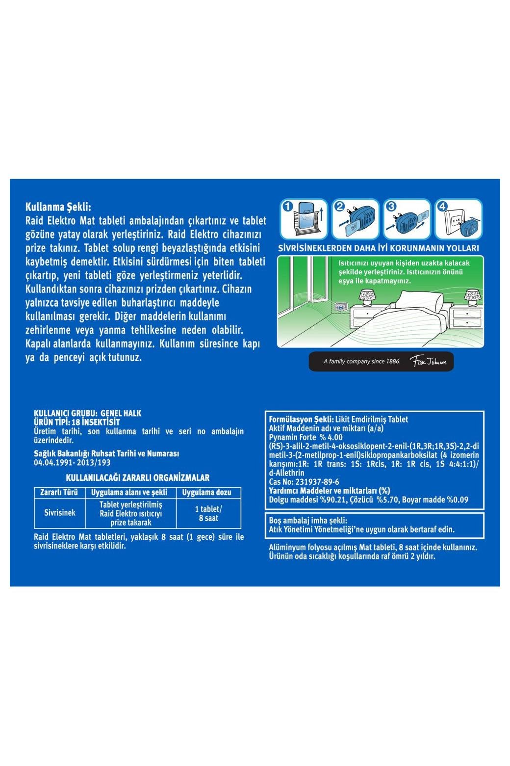 Not: Raid Elektromat yalnızca kapalı alanlarda kullanılmalıdır. Kullanım sırasında oda havalandırılmalı, çocukların ve evcil hayvanların erişemeyeceği yerde muhafaza edilmelidir. Ürün insektisit içerdiğinden ambalaj üzerindeki güvenlik talimatlarını dikkatle okuyunuz.